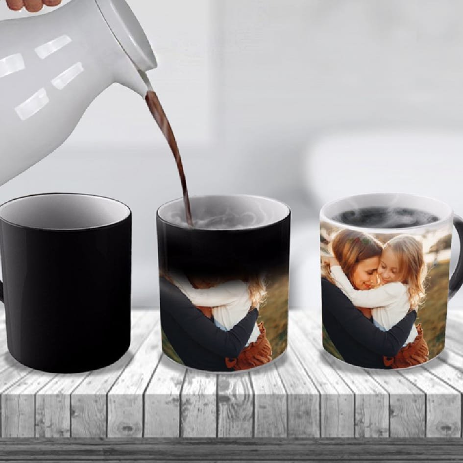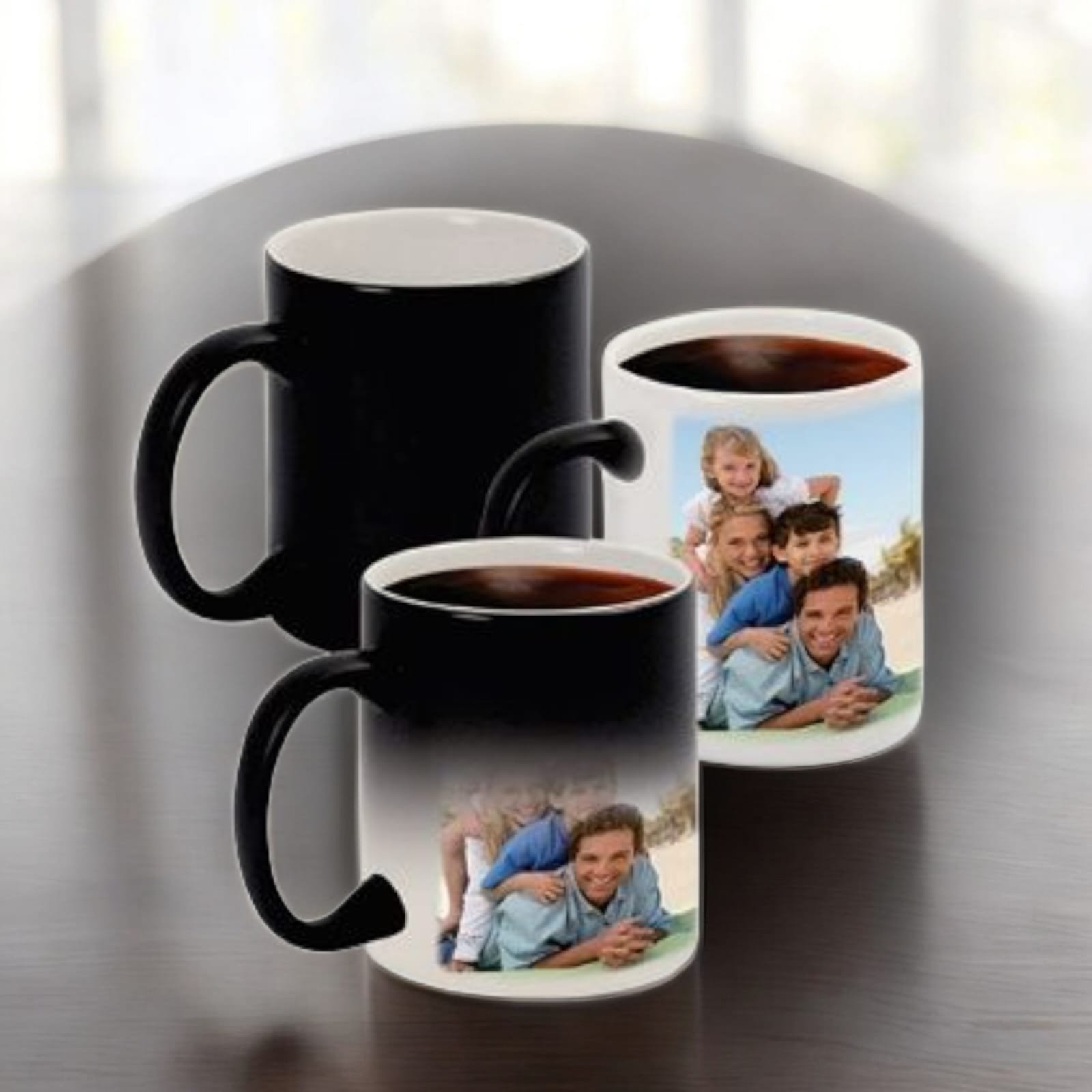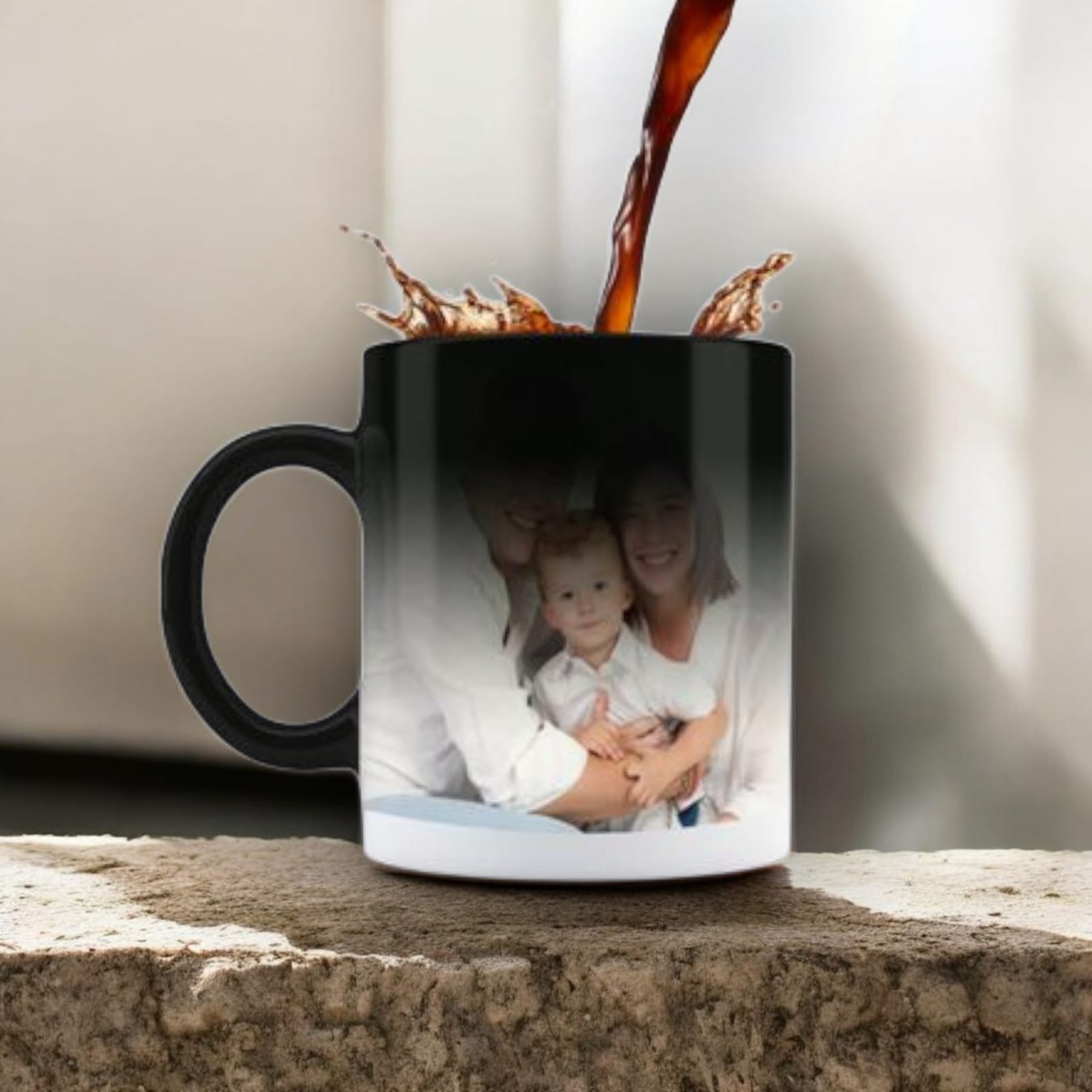 A simple vista es negra, pero al verter una bebida caliente, revela la imagen o diseño personalizado que elijas. ¡Magia pura para tus mañanas o para regalar algo realmente original!